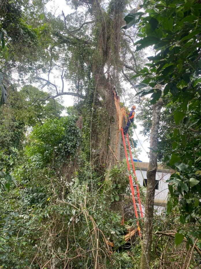 Uma paineira centenária precisou ser cortada na tarde de segunda-feira (20) no bairro da Feiticeira, em Ilhabela, após apresentar risco de queda. A árvore estava localizada em um terreno na Rua Dom João Quinto e ameaçava as casas vizinhas.