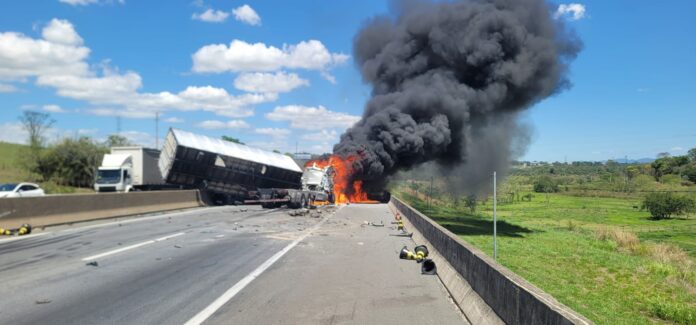 Segundo a Polícia Rodoviária Federal (PRF), a colisão entre os veículos aconteceu por volta das 10h27, na altura do km 101, no sentido São Paulo, e resultou no tombamento de um dos caminhões e no início de incêndio em um caminhão-tanque, que transportava combustível.