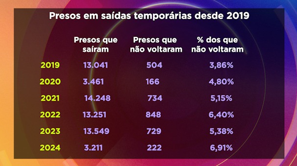 O levantamento foi feito entre 2019 e 2023. Ao todo, 2.981 presos não retornaram do benefício na região neste período. Veja a tabela a baixo: