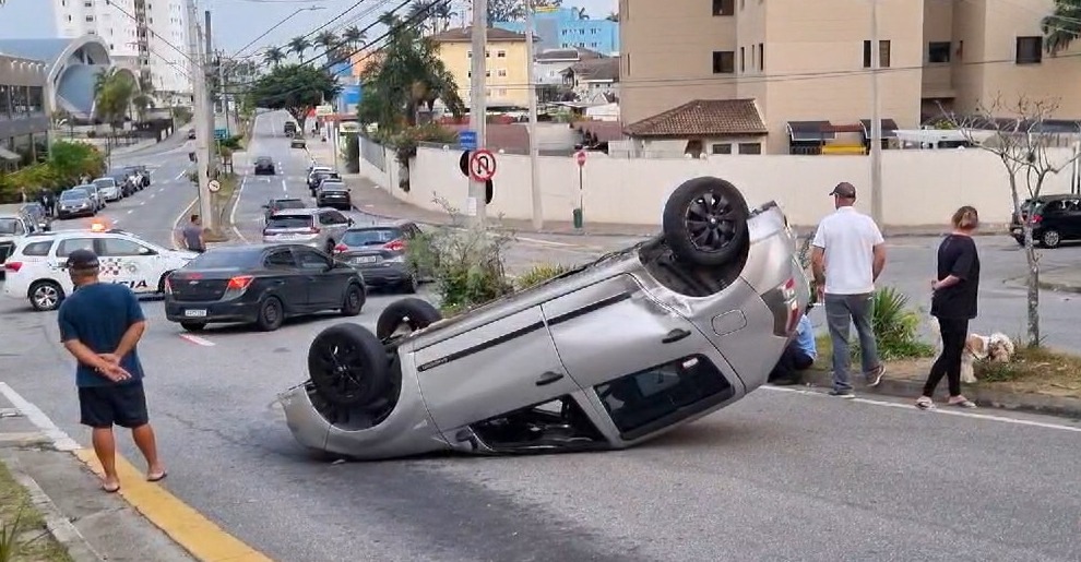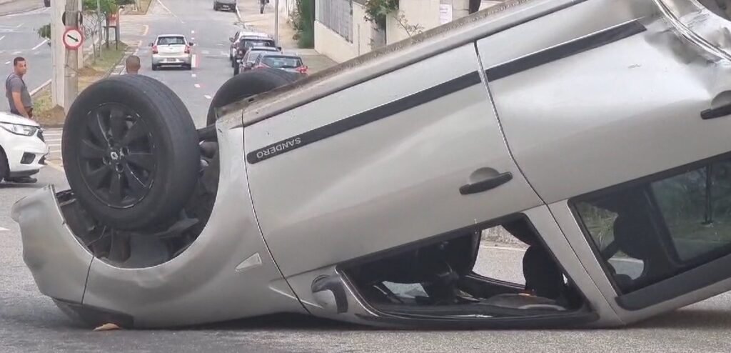 Um carro capotou após bater contra outro veículo na Av. João Paulo II, no bairro Urbanova, em São José dos Campos, nesta terça-feira (8).