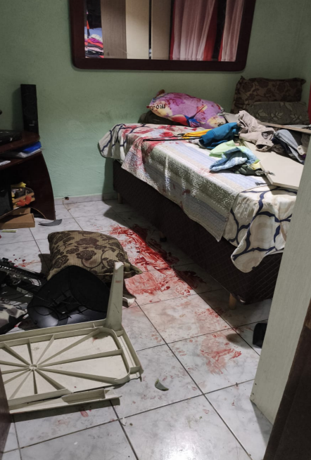 Ao chegarem ao local, os agentes encontraram a porta arrombada e o marido da solicitante caído ao chão, com ferimentos provocados por disparos de arma de fogo e cercado por grande quantidade de sangue. Ele foi atingido após entrar em luta corporal com o invasor e não resistiu aos ferimentos, morrendo ainda no local.