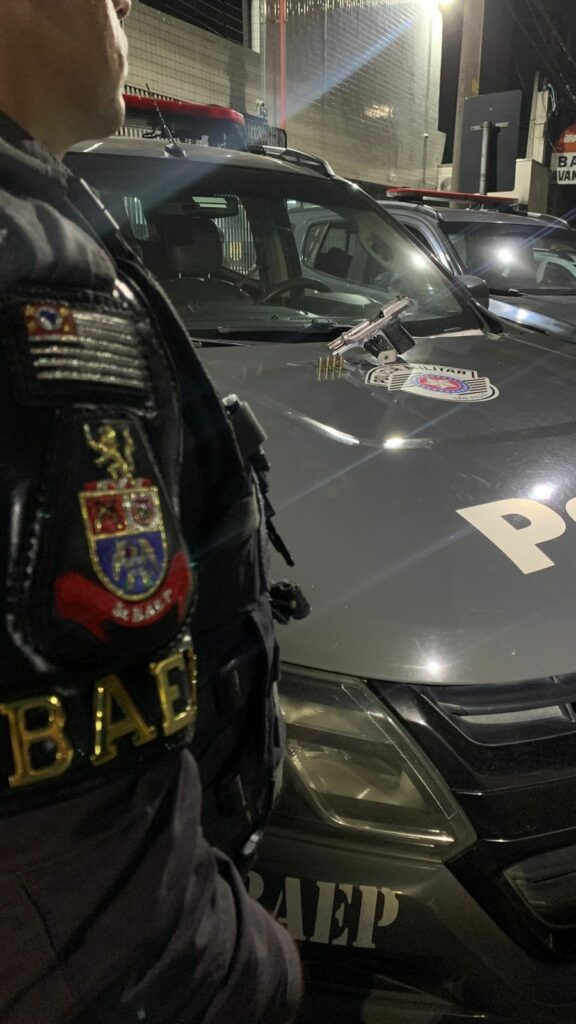 Durante a revista no carro, os policiais encontraram uma pistola calibre .380 com numeração raspada e quatro munições intactas, além de um celular do suspeito.