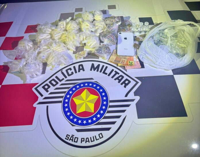 No local indicado, os policiais encontraram a sacola e também mais entorpecentes escondidos em uma tubulação próxima. Foram apreendidos 330 pinos de cocaína, 72 porções de maconha, 15 pedras de crack, 16 frascos de lança-perfume, R$ 80 em dinheiro e um celular.