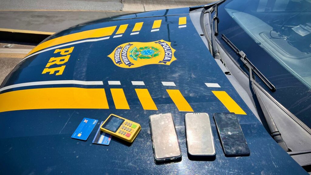 Na vistoria do veículo, os policiais encontraram uma máquina de cartão e dois cartões bancários. Os ocupantes não souberam explicar a origem dos itens.