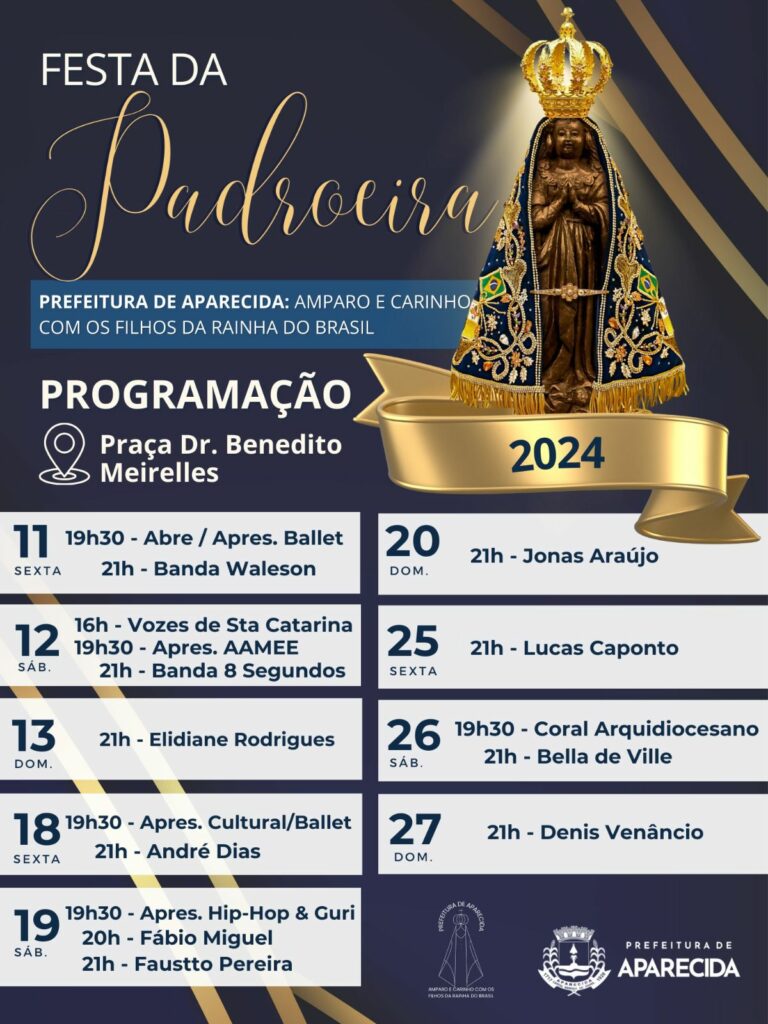 A Prefeitura de Aparecida está com uma programação especial para a festa de Nossa Senhora Aparecida, padroeira da cidade e do Brasil. As comemorações começam nesta sexta-feira (11) e vão até dia 27 de outubro.