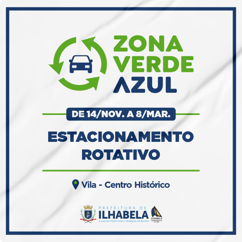 A Prefeitura de Ilhabela inicia, nesta quinta-feira (14), a cobrança do estacionamento rotativo instituído para a alta temporada. O sistema, chamado de “Zona Verde-Azul”, é válido apenas para carros estacionados nas ruas da Vila e do Centro Histórico da cidade.