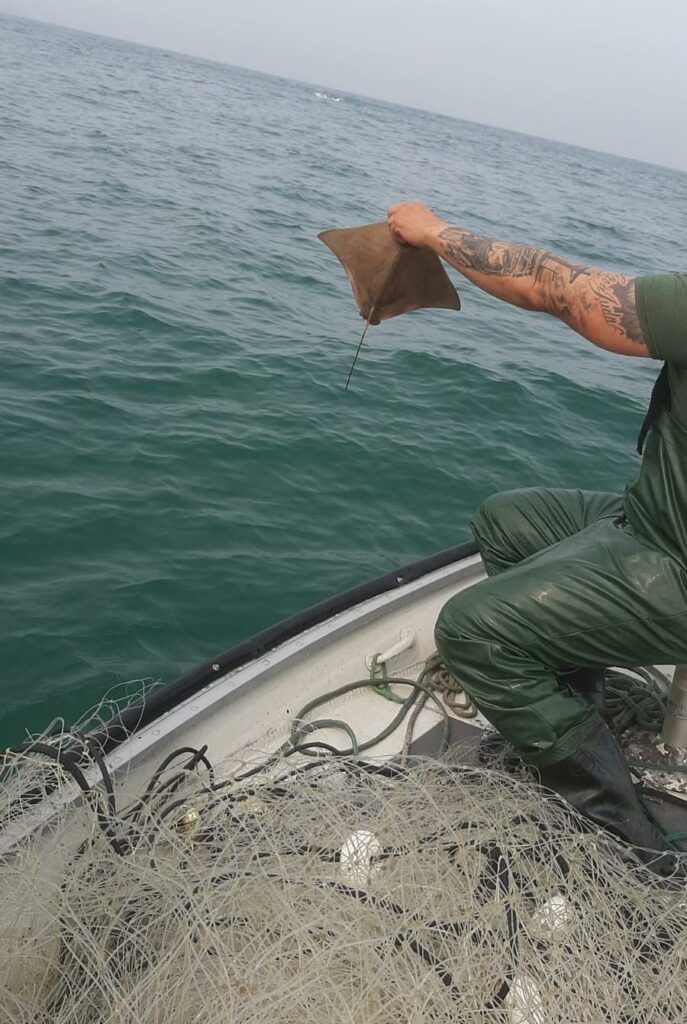 Os policiais encontraram e apreenderam duas redes de emalhe de fundo, na região da Praia do Capricórnio. O animal marinho, que estava preso na rede, foi retirado e devolvido ao mar. A raia ticonha é uma espécie listada como vulnerável à extinção.