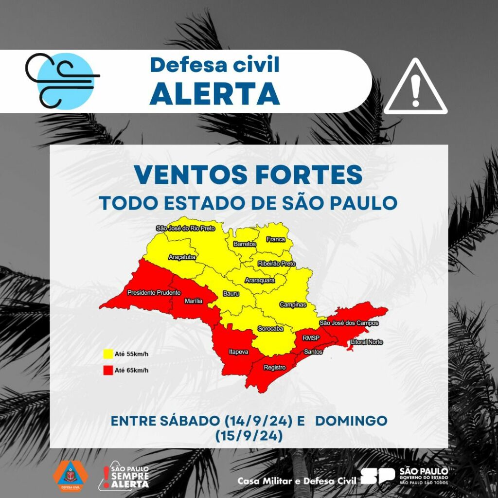 O alerta é válido para todo o estado de São Paulo, segundo a Defesa Civil. As rajadas de vento podem chegar até 55 km/h no interior paulista e até 65 km/h na região do Vale do Paraíba e Litoral Norte.