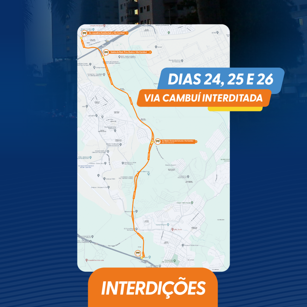 - Rotatória do Residencial São Francisco: Interditado apenas a Via Cambuí no sentido Dutra, permanecendo a rotatória liberada para cruzamentos;