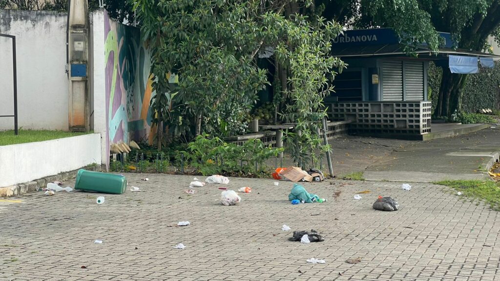 Quando o segundo carro passa por cima da calçada, ele ainda derruba uma lata de lixo e espalha os resíduos na frente de uma farmácia, deixando a sujeira no local.