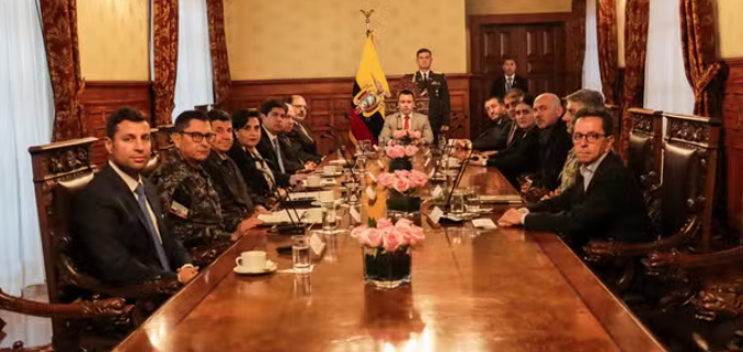 O ex-presidente esquerdista Rafael Correa, que governou o país de 2007 a 2017 e apoiou no pleito do ano passado a candidata derrotada por Noboa, foi outro que declarou “total e irrestrito respaldo” ao presidente, pedindo a ele que não cedesse. Acrescentou ainda que “erros e discrepâncias políticas” seriam discutidos “no dia seguinte à vitória” do Estado sobre as organizações criminosas.