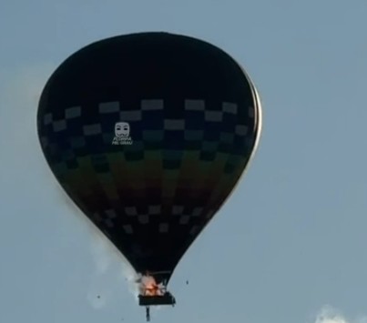 Imagens que circulam nas redes sociais mostram o balão pegando fogo e despencando no chão.