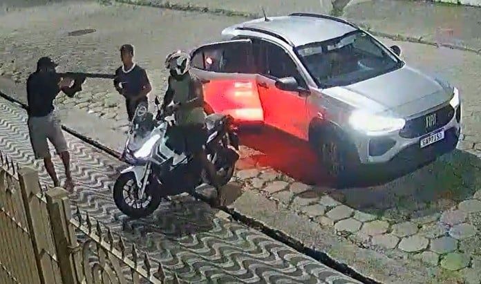 Bandidos armados com fuzil e pistola roubaram um casal que tinha acabado de chegar em casa, no bairro Jardim Independência, em São Vicente, Litoral de São Paulo. Em um vídeo obtido pela TV Thathi Band Litoral, os bandidos descem de um carro e apontam um fuzil no rosto do homem. O caso aconteceu na madrugada desta terça-feira (09).