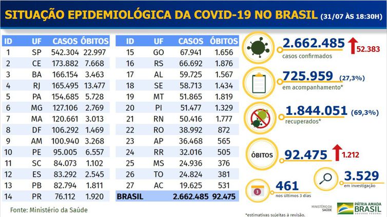 Sobre casos confirmados, o balanço mostra 2.662.485 casos acumulados do novo coronavírus. Só nas últimas 24 horas, foram 52.383 notificações.