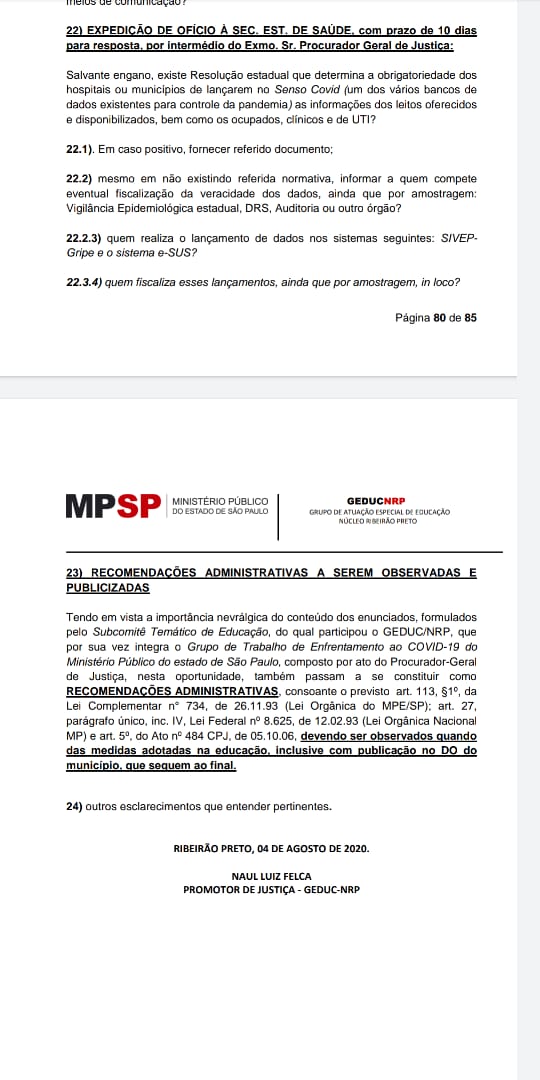 No documento expedido, com base em dados científicos e estatísticos emitidos por instituições como a ONU, OMS e documentos como o Estatuto da Criança e do Adolescente, o Ministério Público mostra preocupação com as condições necessárias para a retomada das aulas presenciais. Naul Felca lembra que, só em Ribeirão Preto, a rede municipal engloba 47 mil alunos em 109 unidades escolares, além de 2.744 docentes e 1.616 funcionários.