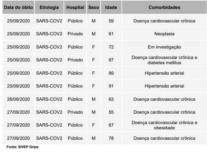 Entre os novos mortos, as idades eram entre 55 e 91 anos. Foram cinco homens e cinco mulheres, sendo que os óbitos ocorreram entre os dias 25 e 27 de setembro. Nove entre os dez tinham comorbidades.