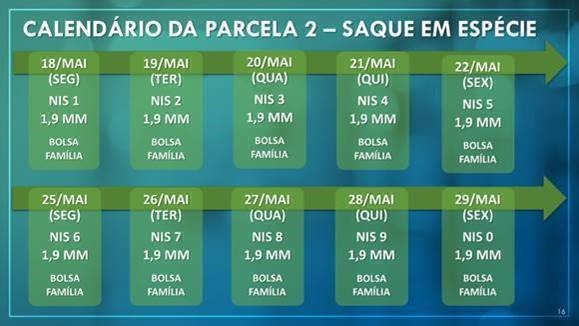 Os beneficiários do Bolsa Família elegíveis para receber o auxílio poderão sacar em espécie, da mesma forma do benefício regular, conforme o número final do Número de Identificação Social (NIS). O calendário para este público já inicia nesta segunda-feira (18) conforme quadro a seguir: