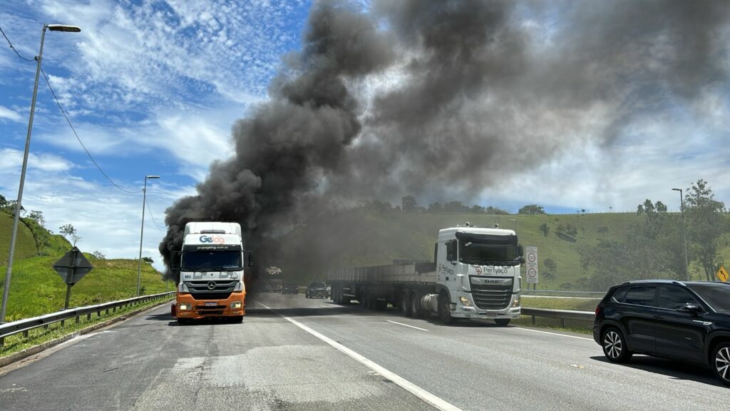 Um caminhão pegou fogo e interrompeu o tráfego na rodovia Carvalho Pinto, em Jacareí, na manhã desta quinta-feira (23). Ninguém se feriu.