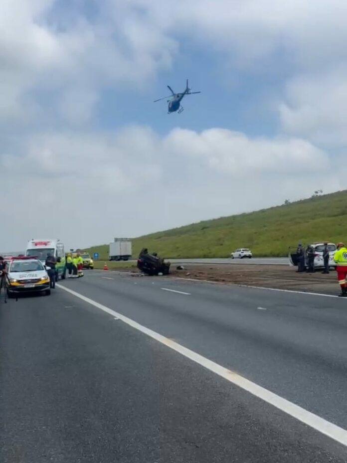 Três pessoas ficaram feridas após um carro capotar no trecho de Caçapava da rodovia Carvalho Pinto, na manhã desta sexta-feira (14).