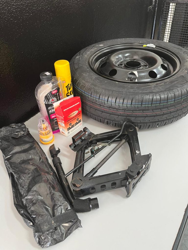 A viatura conseguiu deter os ladrões pouco tempo depois. Durante a abordagem, foram encontrados objetos, ferramentas e o estepe que estavam no veículo da vítima.