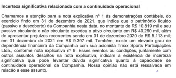 “Também existe um elevado grau de dependência financeira da companhia com a sua acionista Trexx Sports (…) Esses eventos ou condições (…) indicam a incerteza significativa, que pode levantar dúvida significativa quanto á capacidade de continuidade operacional da Companhia”, diz o relatório.