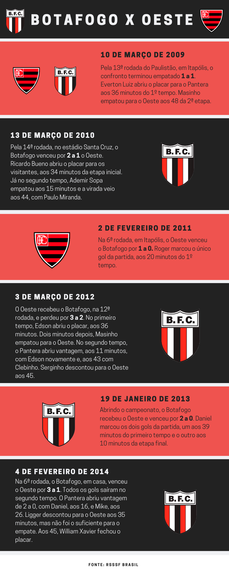 Relembre abaixo os confrontos de Botafogo e Oeste pelo Paulistão