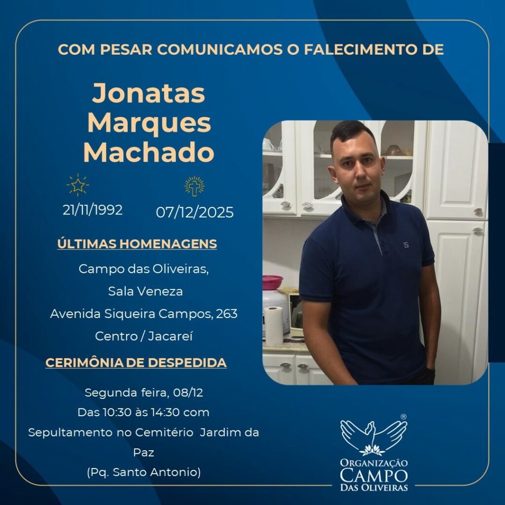 O sepultamento de Jonatas acontece das 10h30 às 14h30 desta segunda (8), no Cemitério Jardim da Paz, em Jacareí.