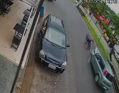 Nas imagens é possível ver o momento da colisão, o motociclista acaba tendo que ir para a contra mão para desviar de uma van que iria entrar em uma rua, e no momento do desvio, bate em frente a carro.
