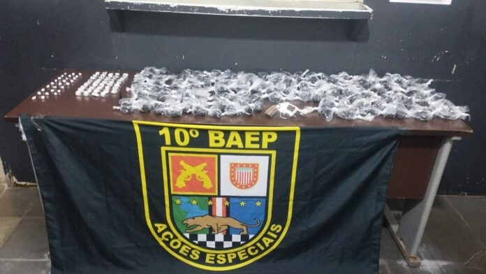 Os policiais pararam uma motocicleta com dois ocupantes. O condutor, que trabalha como motoboy por aplicativo, disse que estava realizando uma corrida para o passageiro. Durante a revista, nada de irregular foi encontrado com ele. No entanto, o garupa carregava uma sacola com diferentes tipos de entorpecentes.