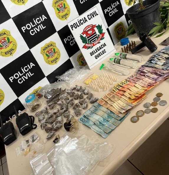 Além dos entorpecentes, os policiais apreenderam uma pistola calibre .32 da marca Taurus com 14 munições intactas, R$ 900,35, dois rádios transmissores, uma balança de precisão, materiais utilizados para fracionar e embalar drogas, como sacos plásticos, microtubos e lâminas de barbear, seis aparelhos celulares e uma motocicleta sem placa, sem número de chassi visível e com indícios de adulteração.