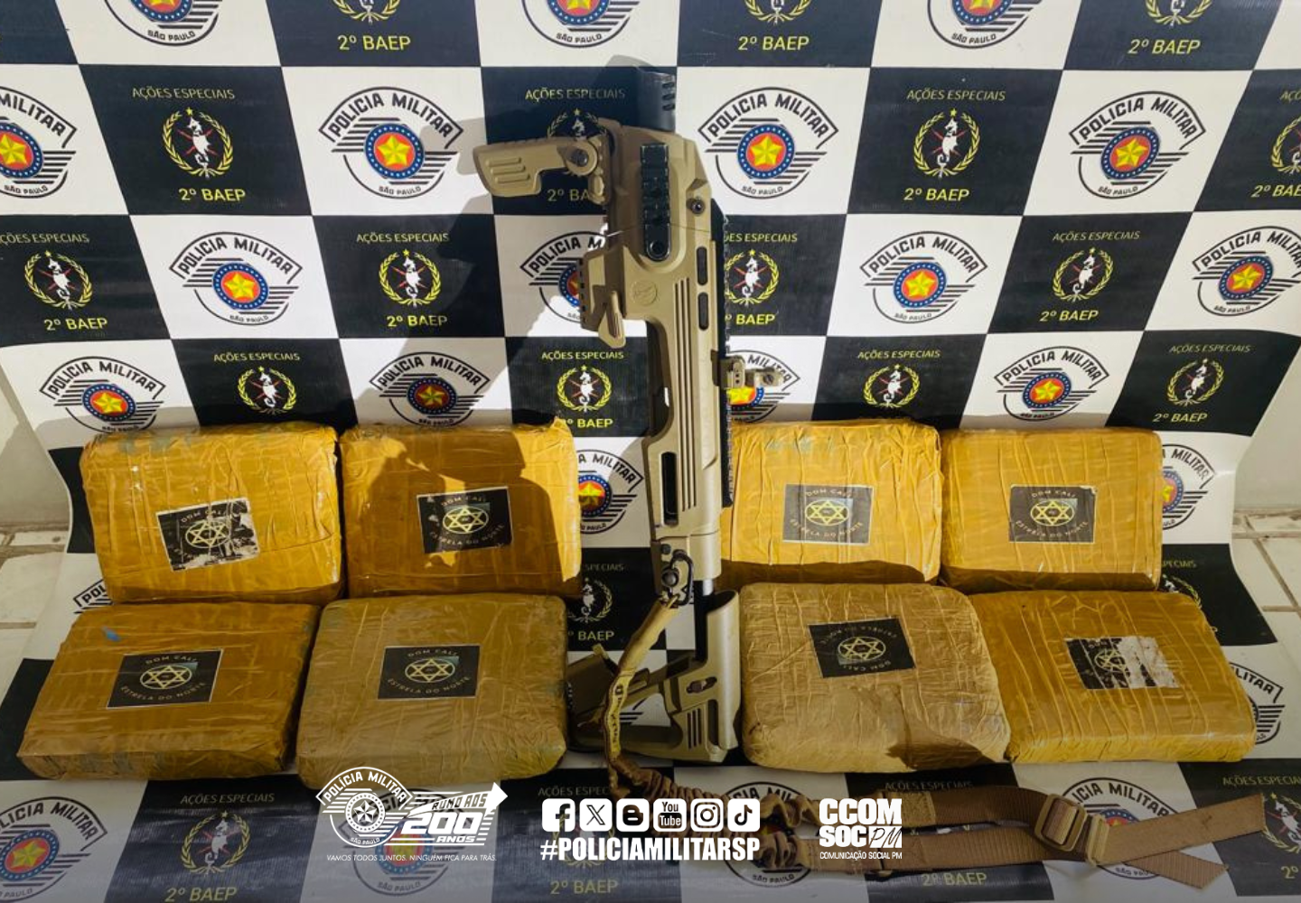 Ao suspeitar do local, os policias cavaram onde estava mexido e encontraram um segundo tonel. Ao abrir, foram encontrados oito tijolos de maconha e um ‘kit Roni’, utilizado para dar uma maior estabilidade e aumentar o potencial da arma de fogo.