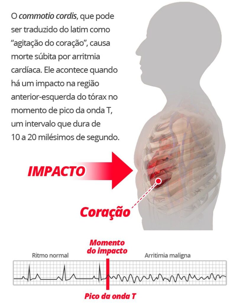 Diferentemente do que muitas pessoas imaginam, não é o objeto “amassando” o coração. É um estímulo elétrico anômalo provocado pelo impacto no timing crítico do ciclo cardíaco.