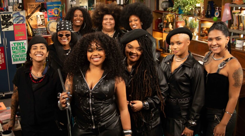 A escolha desta formação para o Tiny Desk Brasil é muito simbólica e carregada de energias inovadoras e revolucionárias. “Eu queria uma banda feminina e de mulheres negras em todos os instrumentos. As pessoas que assistem precisam entender e ver como possibilidade que uma criança negra pode começar a tocar piano, trompete, ser DJ, cantar, ser baterista, baixista e guitarrista. Que é uma realidade que infelizmente ainda é um pouco distante principalmente para crianças periféricas. Acho que a gente está aqui abrindo um portal para isso. Para que essas crianças existam, queiram, tenham vontade e curiosidade de saber como é e tocar um instrumento”, conta a talentosa cantora e compositora.