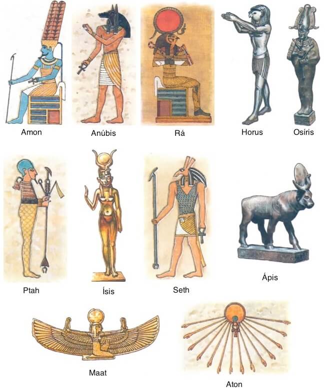 A religião dos egípcios se baseava no politeísmo, havendo o culto de diversos deuses, cada um deles relacionado a forças da natureza ou aspectos cotidianos, sendo os principais: Rá (Deus-Sol) e Osíris (conhecido como Deus dos Mortos).
