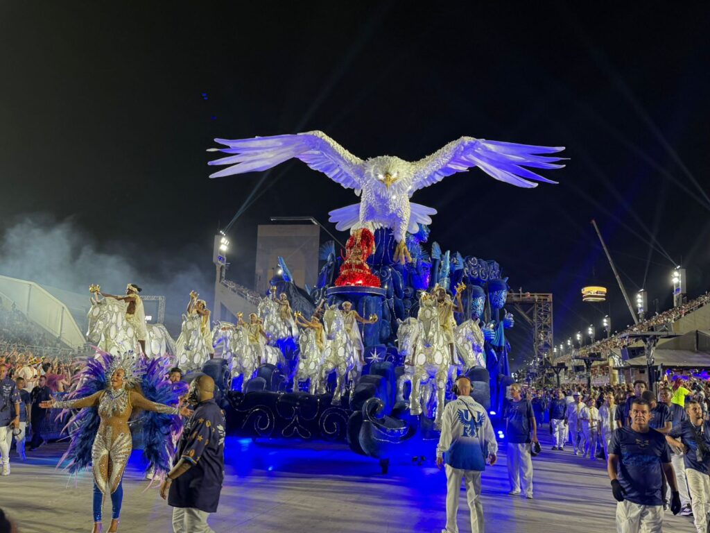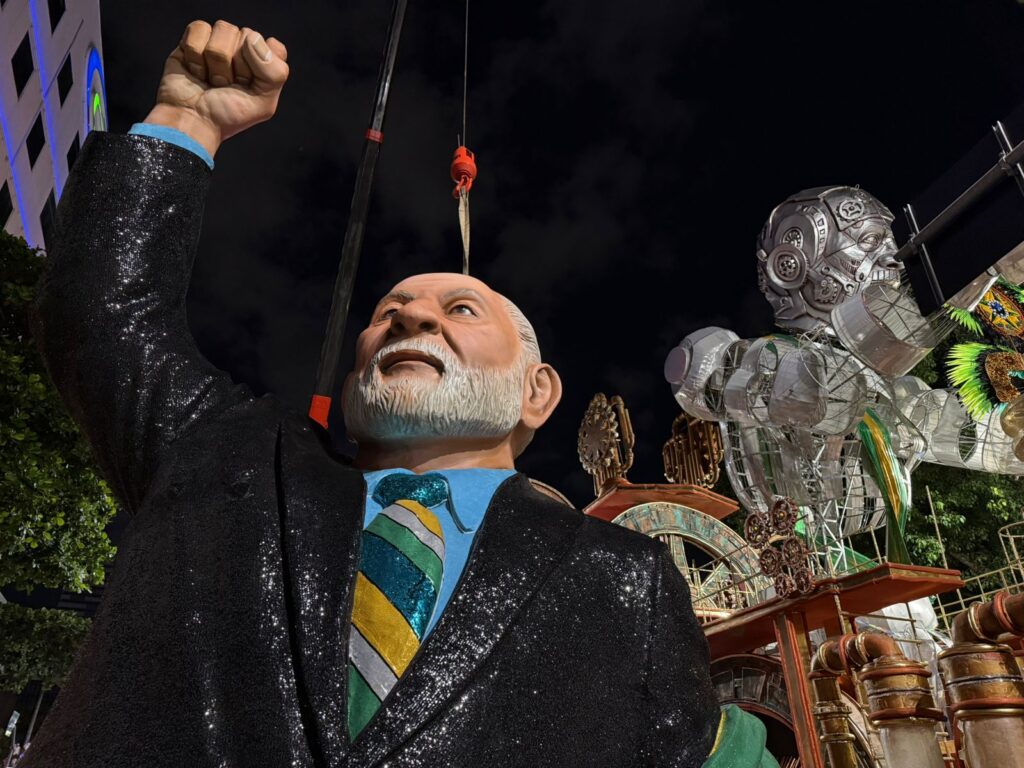 Na comissão de frente, o público viu uma encenação inspirada na rampa do Palácio do Planalto, em referência à mais recente cerimônia de posse de Lula, marcada pela presença de representantes da sociedade civil. A apresentação também trouxe atores e bailarinos caracterizados como o ministro Alexandre de Moraes e os ex-presidentes Dilma Rousseff, Michel Temer e Jair Bolsonaro, compondo um retrato simbólico de diferentes momentos da política recente do país.