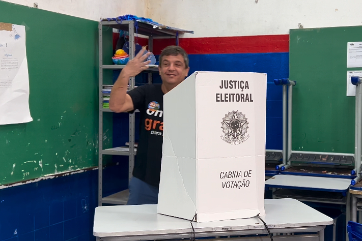 O candidato Cláudio Fernando (NOVO), votou pela manhã na escola Marcilio Dias, em Vicente de Carvalho.